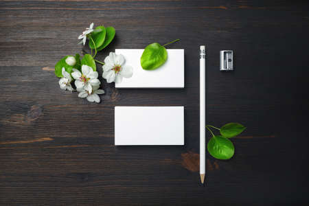 Blank business cards, pencil, sharpener and spring flowers on wood table background. Branding identity template. Flat lay.