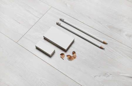 Photo of blank stationery template on light wooden background. Business cards, pencils and eraser. Top view. Flat lay.
