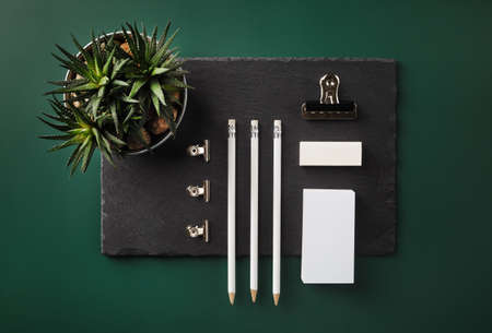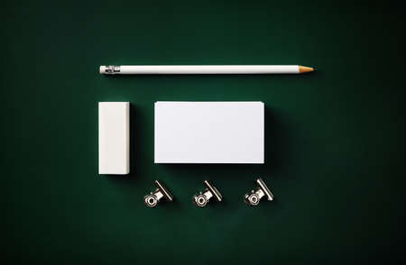 Brand ID mockup. Blank white business card, pencil, eraser and clips on green background. flat lay.
