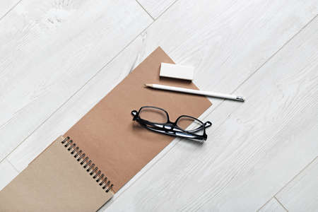 Blank kraft notepad, glasses, pencil and eraser on light wooden floor background. flat lay.
