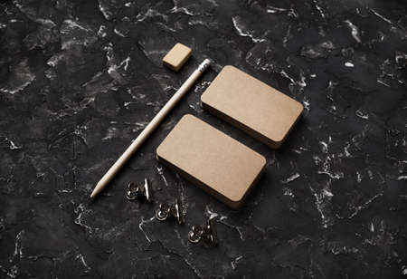 Blank business card, pencil, eraser and clips on stone board.