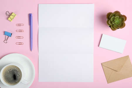 Blank card with envelopes and stationery on color background