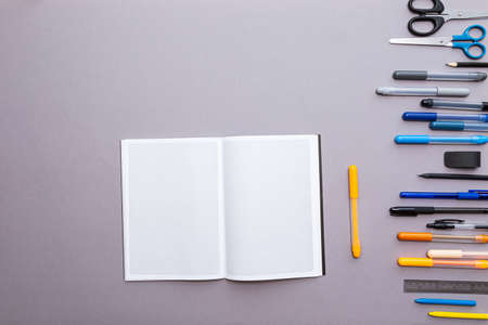 An empty squared notebook and a lot of stationery on a gray background. Education or business concept.