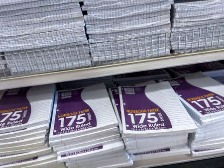 Seattle, WA USA - circa August 2022: Close up, selective focus on wide ruled notebook paper for sale inside a Target retail store.