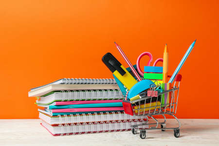 Shopping trolley with school supplies on orange background, space for text