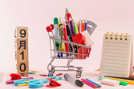School supplies on pink background in shopping cart. View from above. Copy space. Office for the student. Sale by the first of september