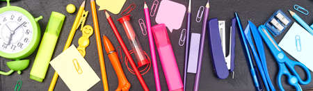 banner back to school, multicolored school supplies, rainbow on school board, flatlay, copyspace