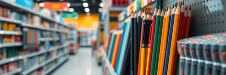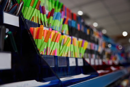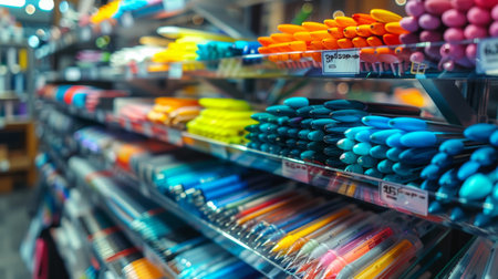 Selective focus of color pens on shelves in a stationary shop