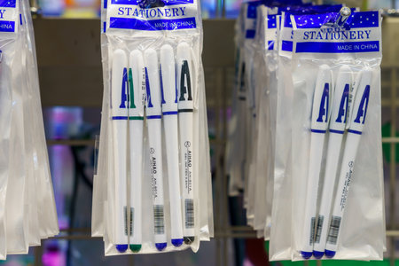 Writing pens with selective focus on a store shelf. Illustrative editorial. February 2, 2022 Balti Moldova