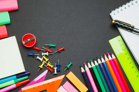 Colorful stationery on black background. top view