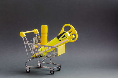 Shopping cart with different stationery on the yellow background.