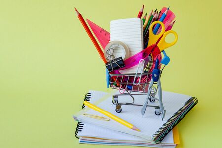 Shopping basket with school stationery, yellow, on a gray-green background. Lets go back to the concept of school education.Bright school supplies in a metal shopping basket