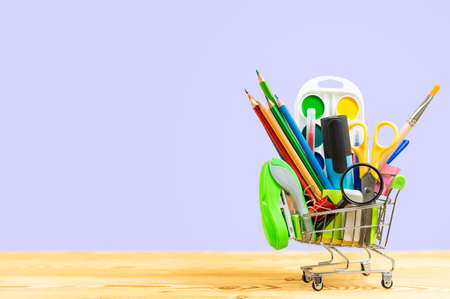 back to school. stationery in a grocery cart on a wooden table on a blue background