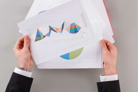 Businessman reviewing data in financial charts and graphs. Male hands holding documents with statistics information. Accounting concept.