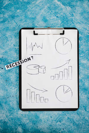 recession and stagnating economy conceptual image with text next to clipboard showing a multitude of stas and graphs