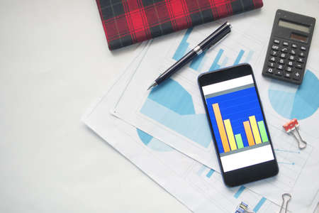top view of financial chart display on smart phone on table