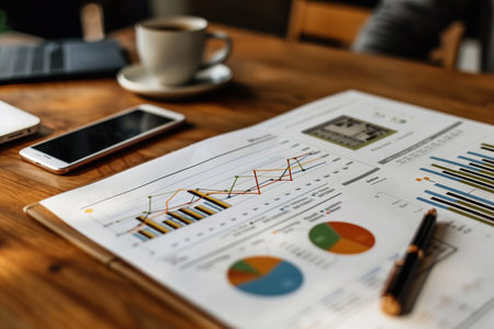 A high-resolution image of a financial report featuring colorful bar charts and graphs, placed on a desk with a calculator, notepad, and a cup of coffee.