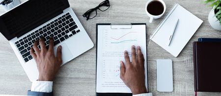 Office workspace top view. African American businessman working at wooden desk, using laptop and various objects all around, panorama with mockup