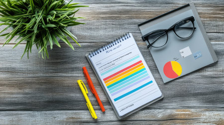 A stylish and organized workspace featuring a notepad, colorful pens, glasses, and a small plant on a rustic wooden table, perfect for enhancing productivity and creativity.