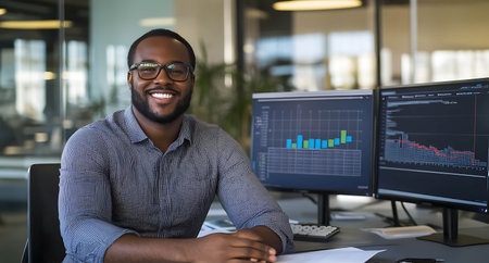 Portrait of smiling african american businessman sitting at desk in office