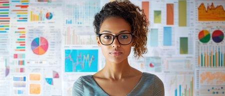 A Businesswoman reviewing data charts with focused expression in bright office