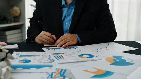 A business professional engages in data analysis, reviewing financial graphs and charts at their desk, reflecting a strategic approach to planning and decision-making.Noogenesis