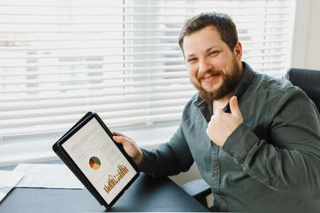Successful manager showing thums up and using tablet with graphs.