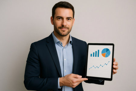Confident businessman pointing at increasing charts displayed on a tablet, representing successful business growth