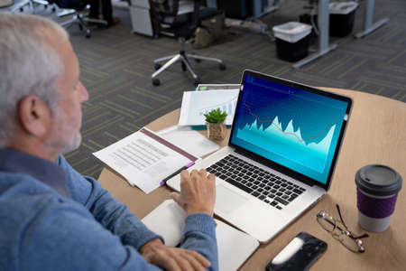 Caucacian senior businessman sitting at desk using laptop with statistical data on screen. business communication and digital interface technology digital composite image.