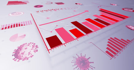 Image of coronavirus Covid 19 cells with red graph statistics recording and data processing on white background. Coronavirus Covid 19 spreading pandemic concept digitally generated image.