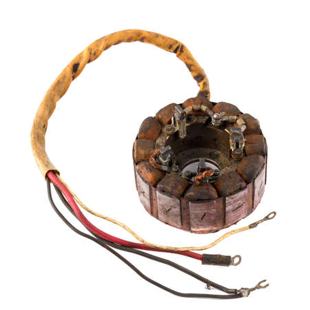 Old stator of a car generator close-up. Repair of a used truck generator. Eye level shooting. Selective focus. Black and white photo