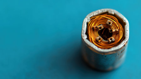 A detailed macro shot of a copper coil component highlighting intricate wiring against a vibrant turquoise background, ideal for technology-related themes.
