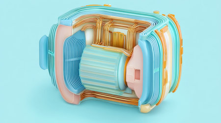 A visually striking abstract design showcasing a colorful mechanical component with intricate tubing on a soothing blue background, perfect for creative projects.