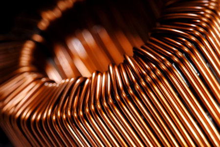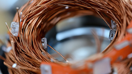 This close-up image captures the intricate details of copper wire coils used in electrical components, showcasing the textures and craftsmanship essential in manufacturing and technology.