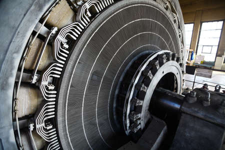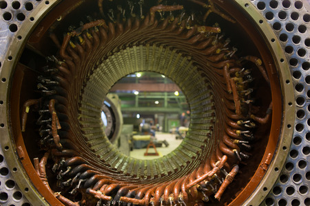 Electric motor stator with winding coil, view of inside of electric induction motor