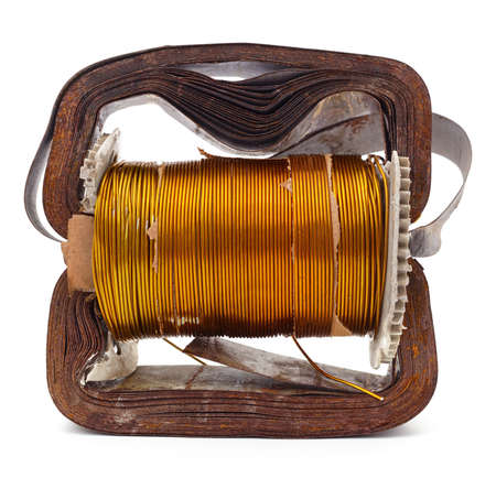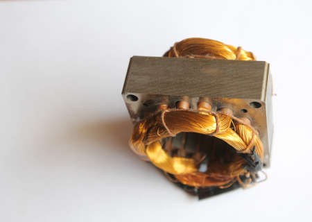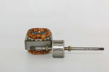 A closeup shot of an electrical machine stator with copper coil wiring isolated on a white background