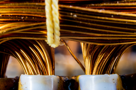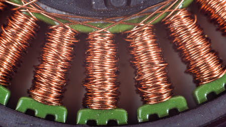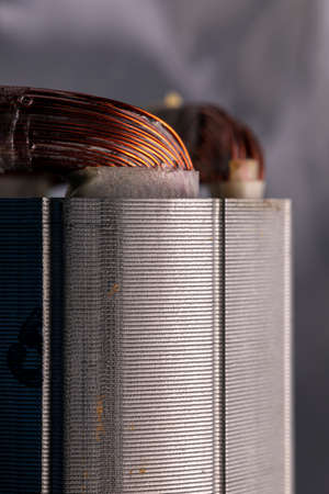 Rotor and stator of an electric motor close up. Copper motor windings.
