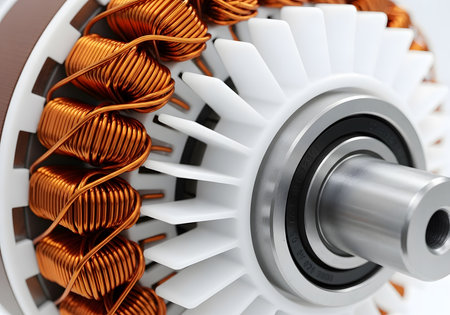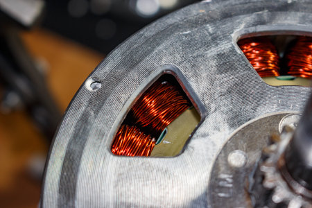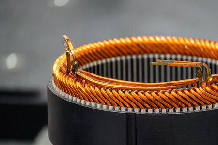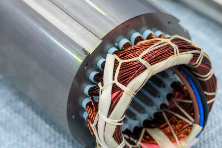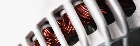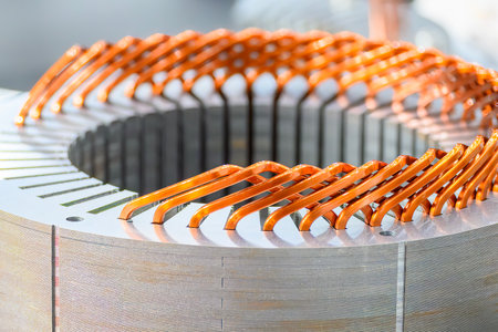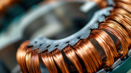 This image showcases a close-up perspective of an electric motor component featuring copper coils and an intricate design, ideal for technology and engineering themes.