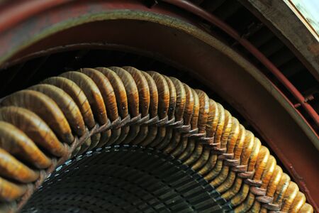 Copper electric motor winding. Electric mechanism rotor. Dark background.