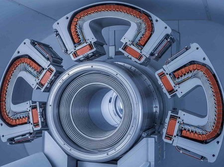 This image features a sleek electric motor with vibrant coiled wires on a bright blue background, highlighting modern technology and engineering.