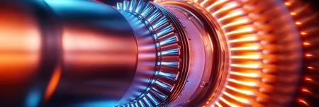 Close-up View of a Futuristic Industrial Turbine Engine with Vibrant Blue and Orange Lighting