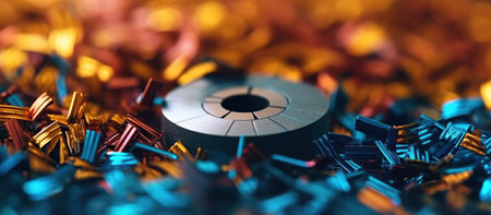 This striking image showcases a metallic circular object with intricate copper wires, emphasizing modern technology and innovative design concepts in engineering.
