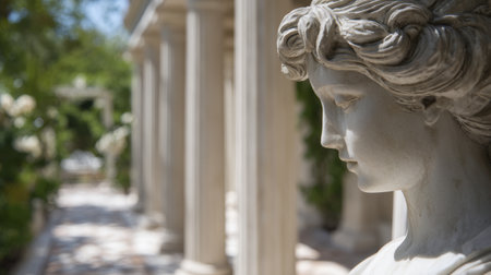 Ancient Greek statue in a serene garden setting
