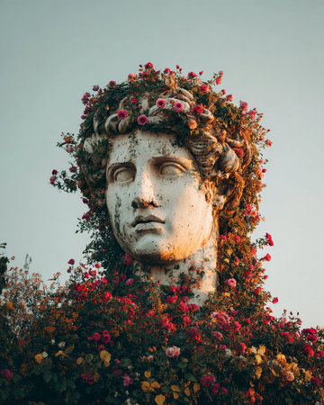 A Greek statue stands covered in ivy and vibrant roses during a warm evening. Nature blends with art beautifully.