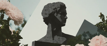 Minimalist collage featuring a black-and-white statue with floral elements and geometric shapes