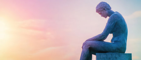 A serene sculpture of a seated figure lost in thought overlooks a beautiful sunset. The soft colors of dusk create a tranquil atmosphere.