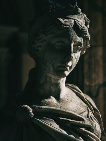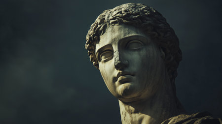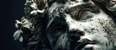 Close-up of an ancient marble statue with intricate details, showcasing classical artistry against a dark background