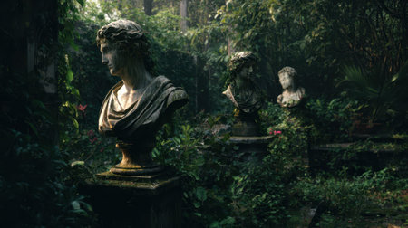 An overgrown garden statue, ancient bust, moss, romantic, forgotten, mysterious, lush foliage