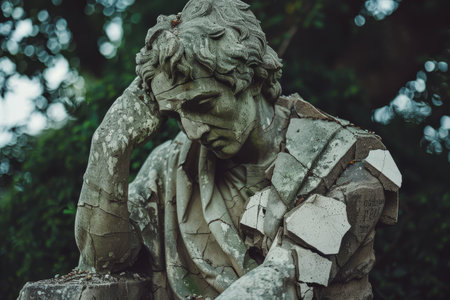 A crumbling statue depicting a man in distress with his head buried in his hands, A cracked and crumbling statue symbolizing a fallen economy