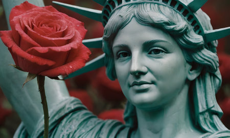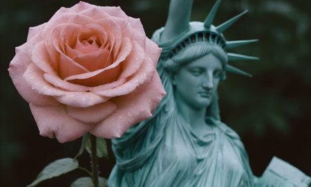 Statue of liberty and rose in the cemetery, closeup.